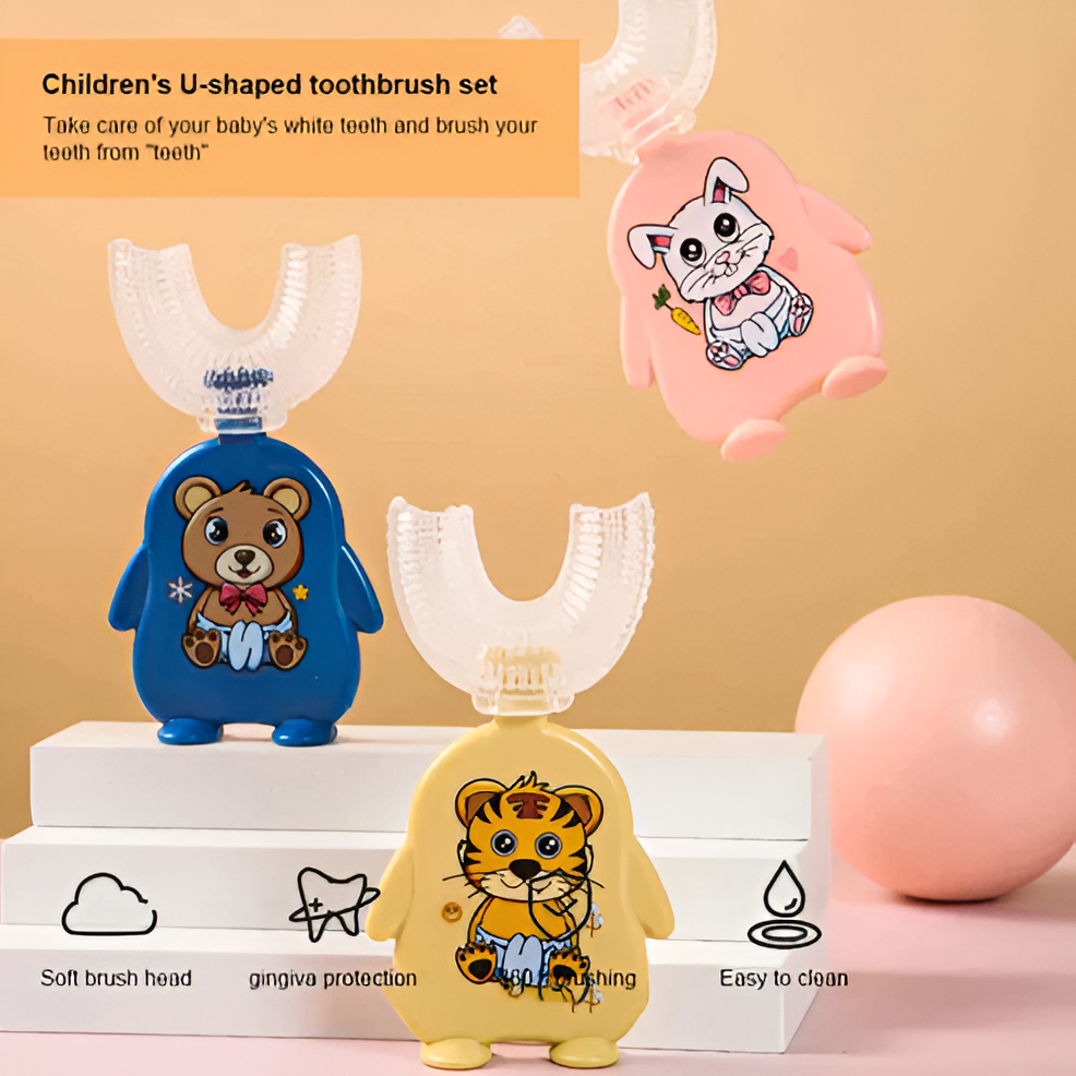U-Shaped Silicone Baby Toothbrush – soft food-grade silicone se bana hua, jo baby ke gums aur teeth ko gently aur evenly clean karta hai. Easy-grip handle, 360° cleaning design aur safe, BPA-free material ke sath daily oral care ke liye ideal.